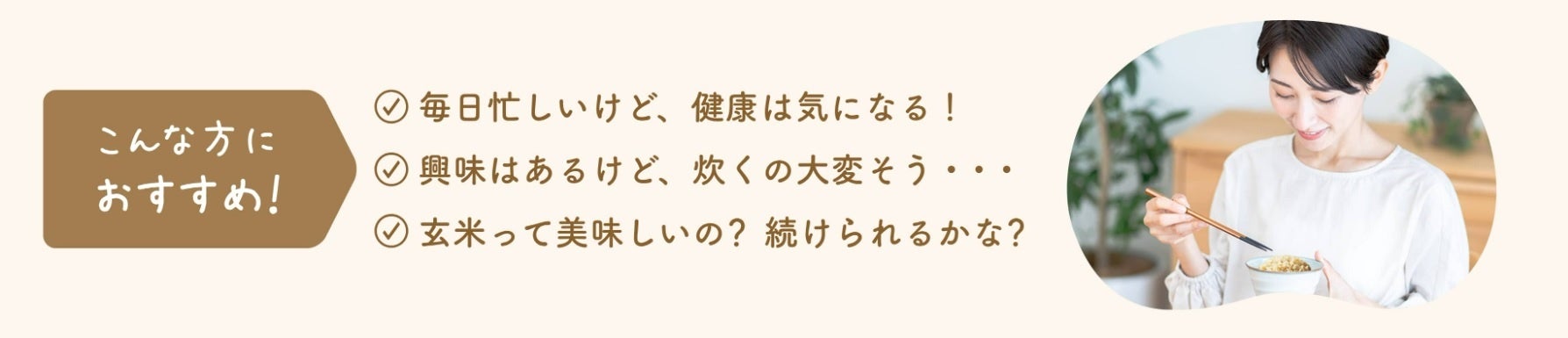 少子高齢化や働く女性の増加、アフターコロナにおける免疫意識の向上に伴い、健康志向はますます高まってきています。そんな中、自然の栄養素がぎゅっとつまった健康米である、玄米への興味関心は高まっているものの、食べ方への不安(炊飯が面倒そう…)や味への不信(硬そう、まずそう…)などから今まで敬遠されてきた方も多くいらっしゃいました。